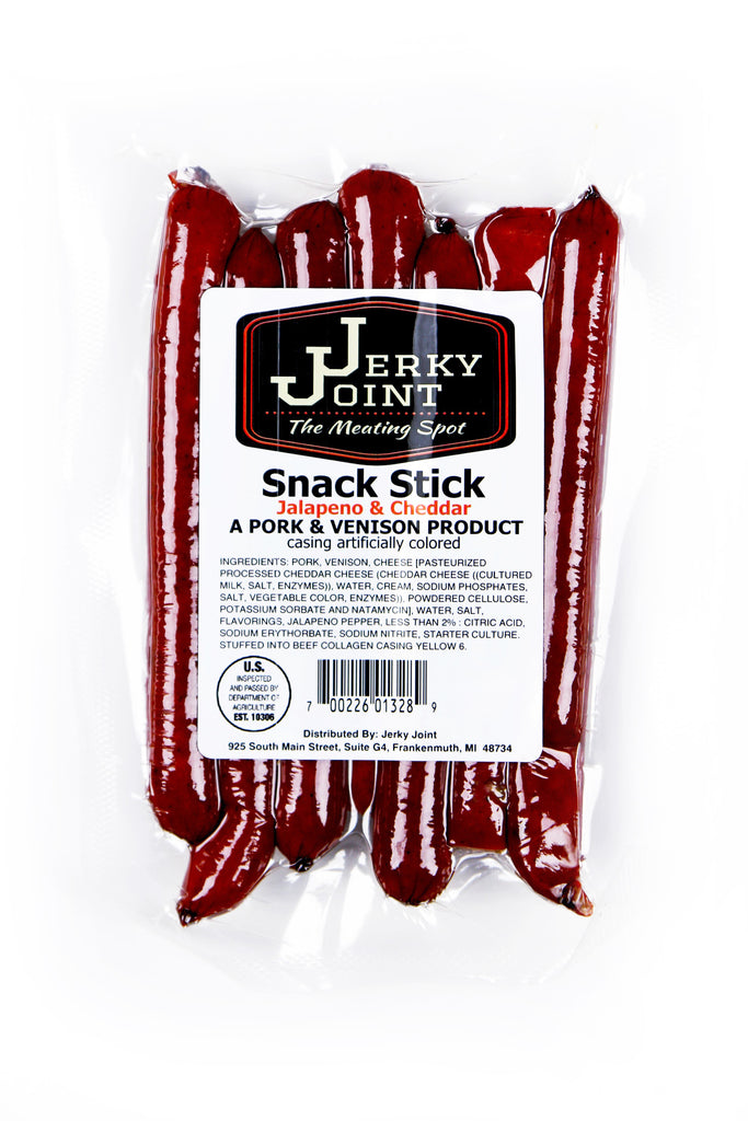 INGREDIENTS: PORK, VENISON, PASTEURIZED PROCESS CHEDDAR CHEESE (CHEDDAR CHEESE (CULTURED MILK, SALT, ENZYMES), WATER, CREAM, SODIUM PHOSPHATES SALT, SORBIC ACID. VEGETABLE COLOR (ANNATTO AND PAPRIKA EXTRACT), POWDERED CELLULOSE, NATAMYON), SALT, DEXTROSE, SPICES, JALAPENO PEPPER, VINEGAR, WATER, ENCAPSULATED CITRIC ACID, GARLIC. CULTURED CELERY POWDER, SEA SALT, STARTER CULTURE. STUFFED INTO BEEF COLLAGEN CASING FO&C RED 3.