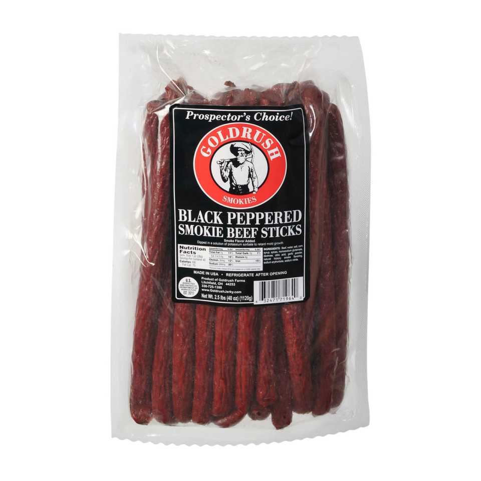 Bag contains approx. 2.5 lb of Black Pepper flavor meat sticks = approx 25 sticks