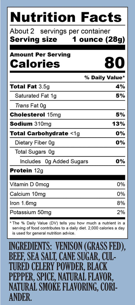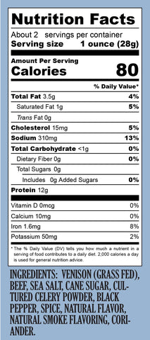 Ingredients: Venison (grass-fed), beef, sea salt, cane sugar, cultured celery powder, black pepper, spice, natural flavor, natural smoke flavoring, coriander.