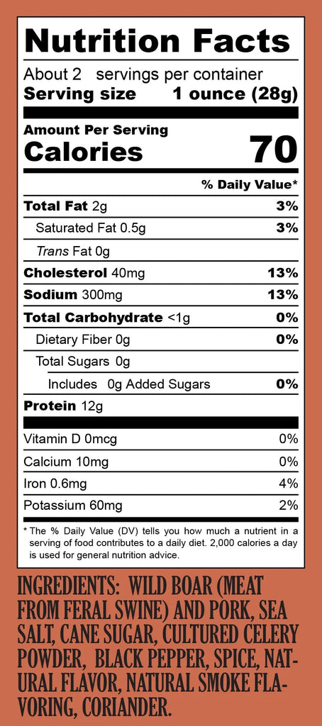Ingredients: Wild boar (meat from feral swine) and pork, sea salt, cane sugar, cultured celery powder, black pepper, spice, natural flavor, natural smoke flavoring, coriander.